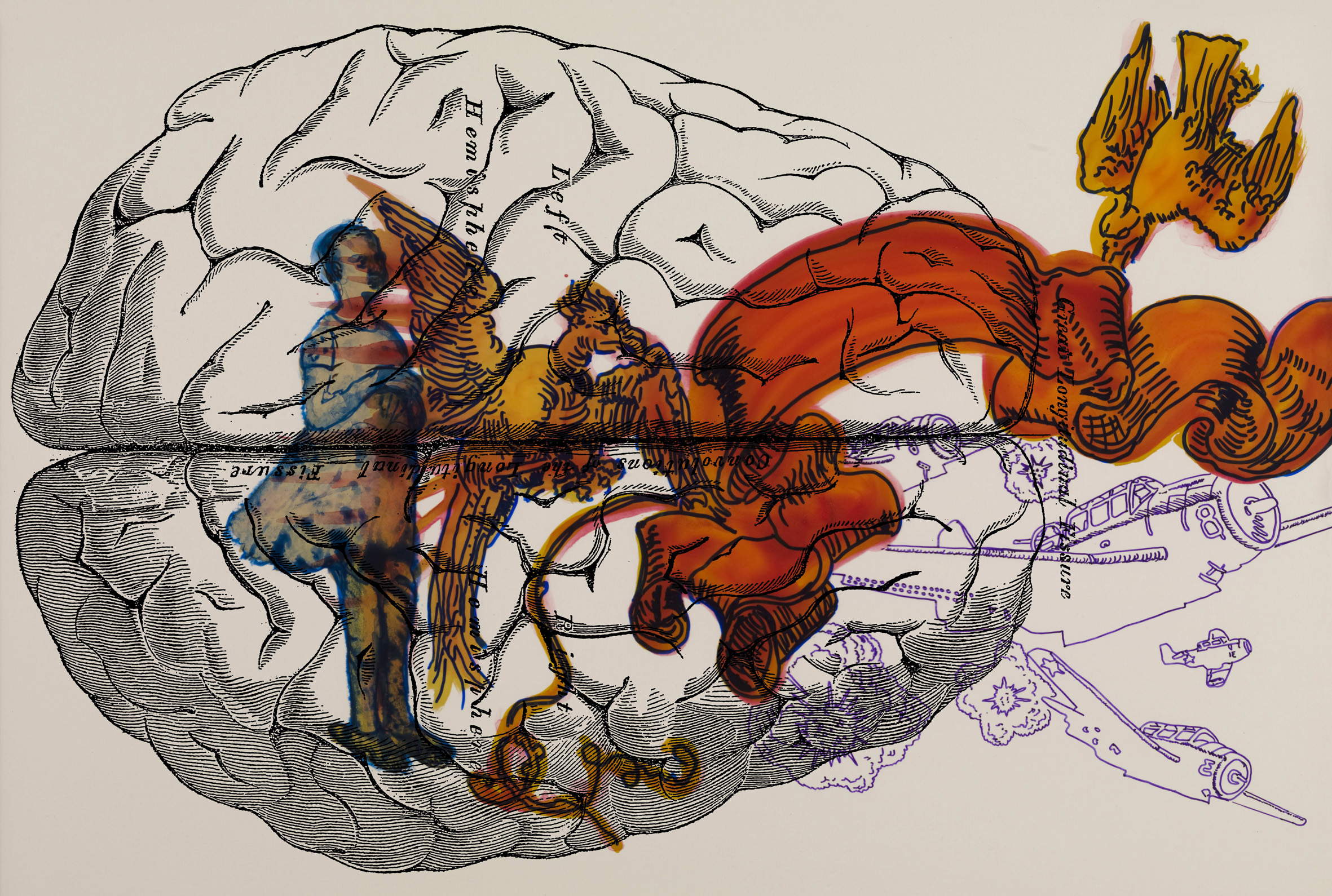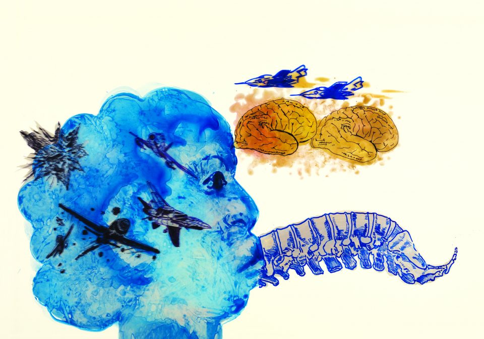 Dans cette image, on voit Cassandre insuffler un vent de vie dans l’épine dorsale pendant que des avions de guerre tournent autour d’elle et de deux cerveaux. Les cerveaux ont presque l’air de fœtus déformés.