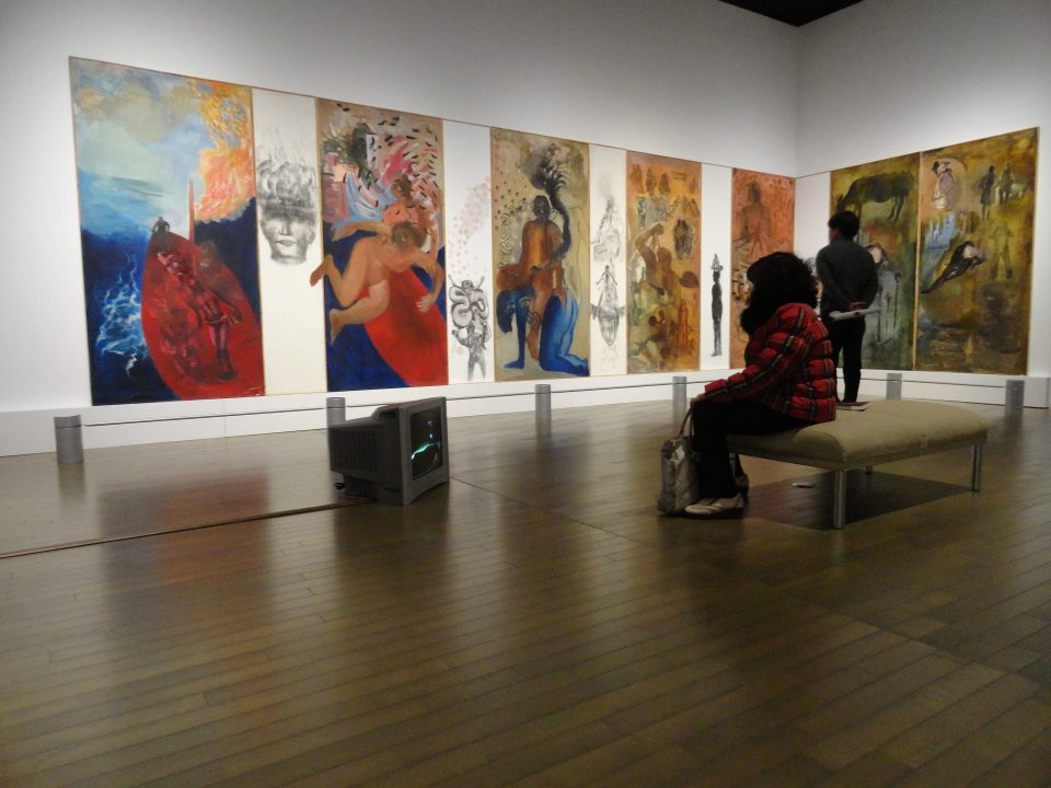 Listening to the Shades, Nalini Malani, œuvre en 42 panneaux, 2008, aquarelle, émail et encre sur feuilles acryliques transparentes