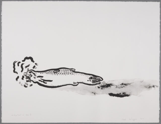 Autoportrait en Carpe VI – Désespérée, l’artiste frétille. Eclaboussé, Arnaud Dubois rit.